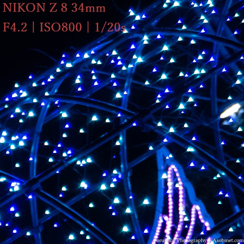コマ収差・非点収差とは主にフレーム四隅で点像が点像として写らないこと。例えば、夜景の人工灯や星、イルミネーションなど。日中でも木漏れ日など、明るい点光源で影響を受ける場合あり。この問題は後処理が出来ないため、光学的に補正する必要あり。