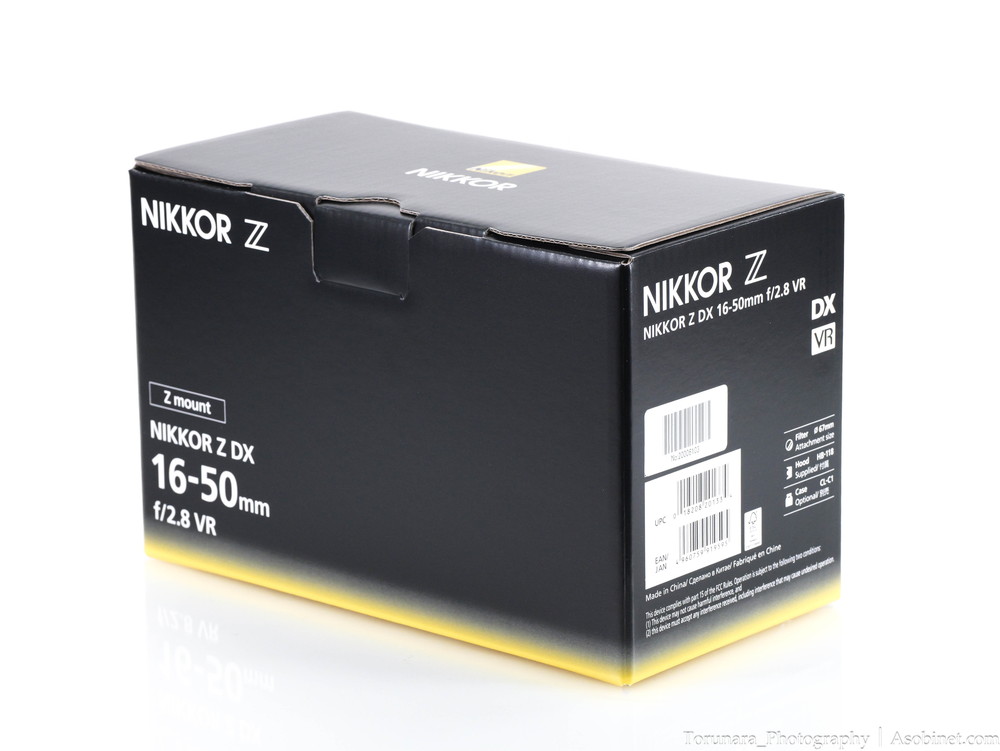 NIKKOR Zらしい、黒と黄色を基調としたデザインの箱。2018年のZシステム始動時から変化はありません。フルサイズシステムと同じ。