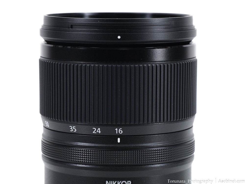 ゴム製の大きなズームリングを搭載。16mmの広角端から50mmの望遠端まで、回転角が90度に満たないストロークで操作することができます。