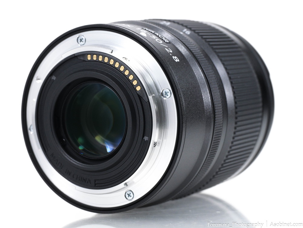 金属製レンズマウントは4本のネジで本体に固定されています。マウント周囲には防塵防滴用のゴムリングがあります。レンズ最後尾周囲のプラスチックリングには「Made in China」の刻印あり。