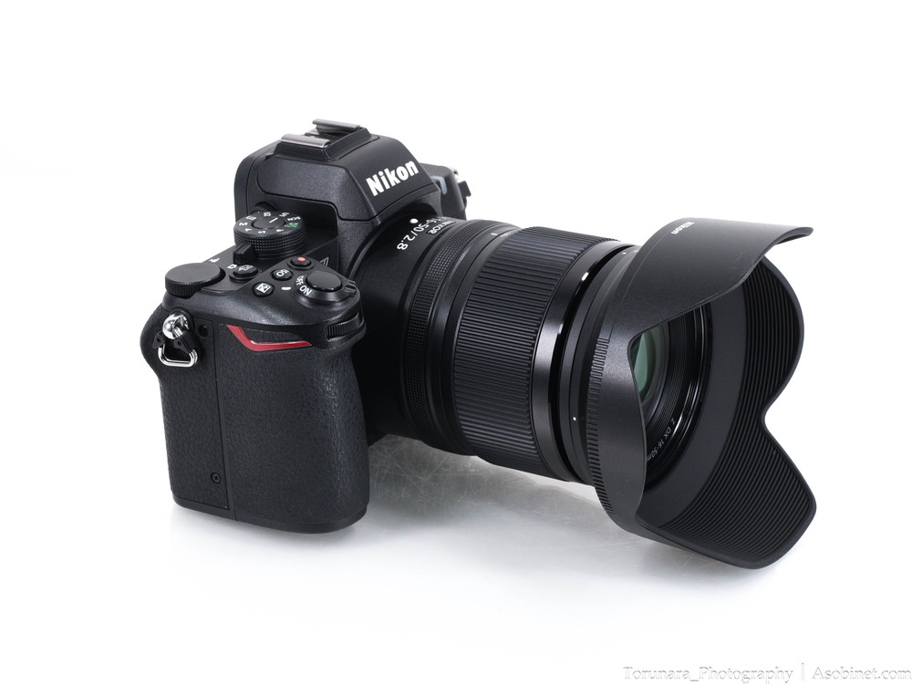 Z50IIに装着。大口径標準ズームとしては大きすぎず重すぎず、常用可能なサイズに抑えられています。片手持ちで姿勢を簡単に保持することができ、カメラバッグへの収納も容易。ただし、レンズフード装着時は少し広めのスペースが必要となります。