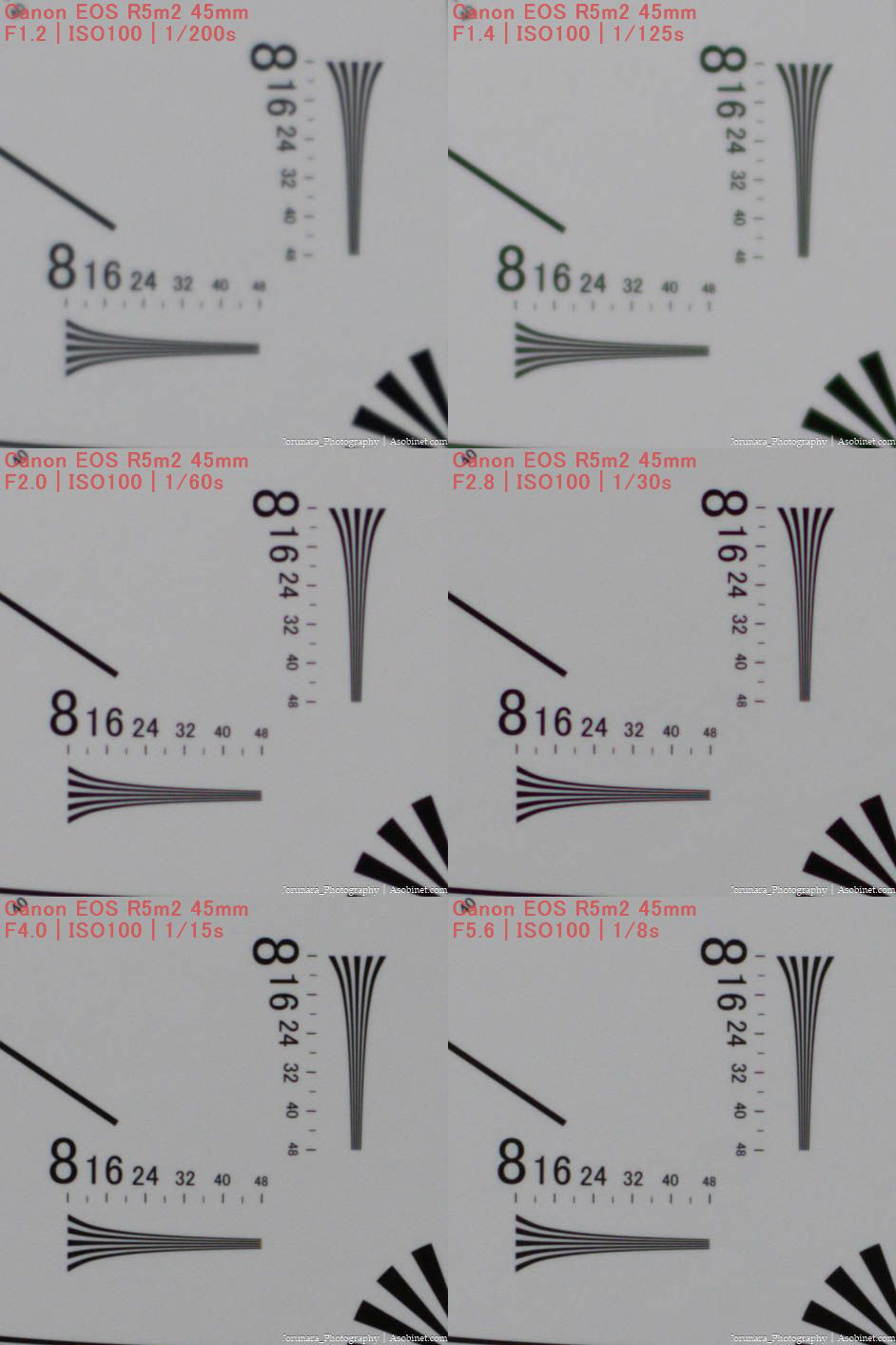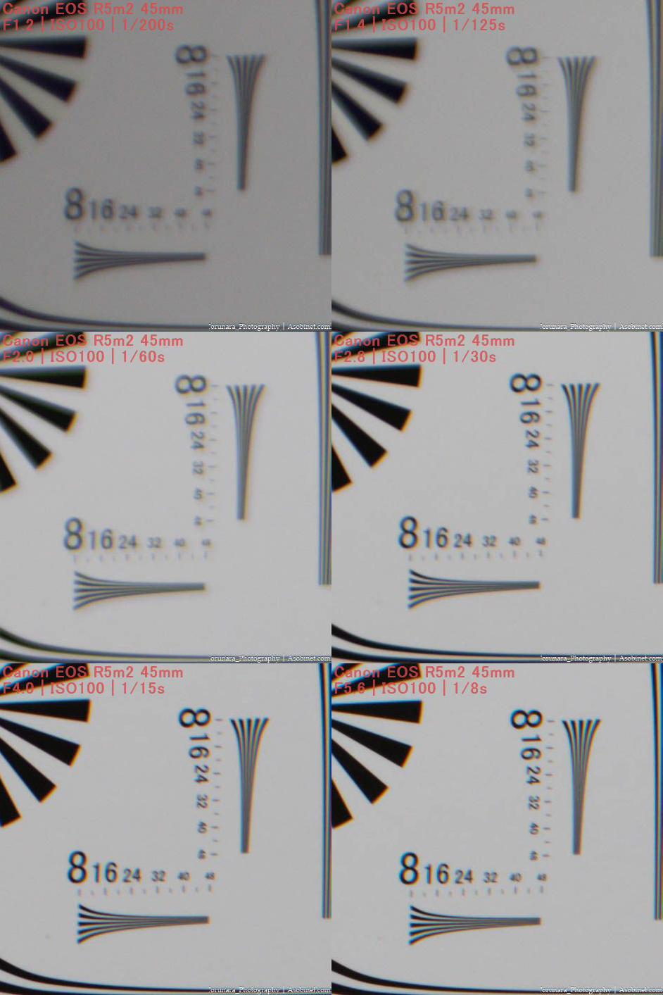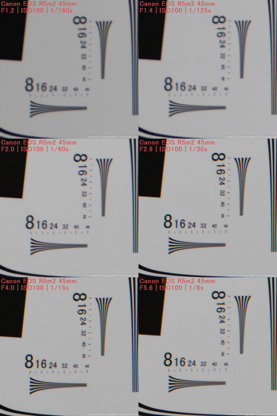 「RF45mm F1.2 STM」のレビュー第二弾 解像チャート編を公開。フォーカスシフトの影響があるものの、しっかりとピントが合った場合は広い範囲で良好な結果が得られるようです。