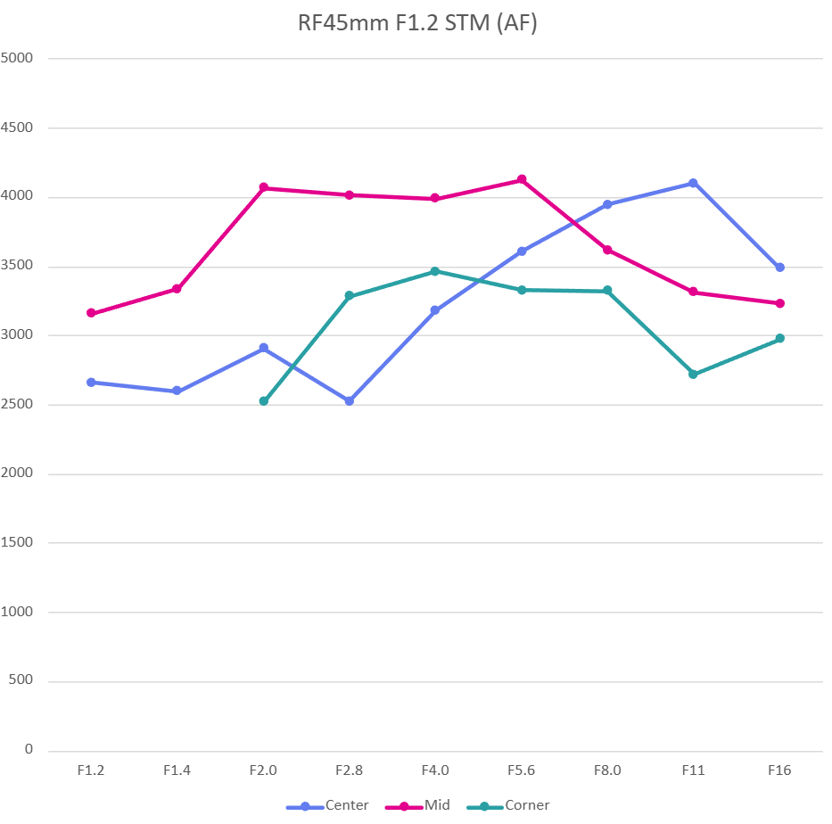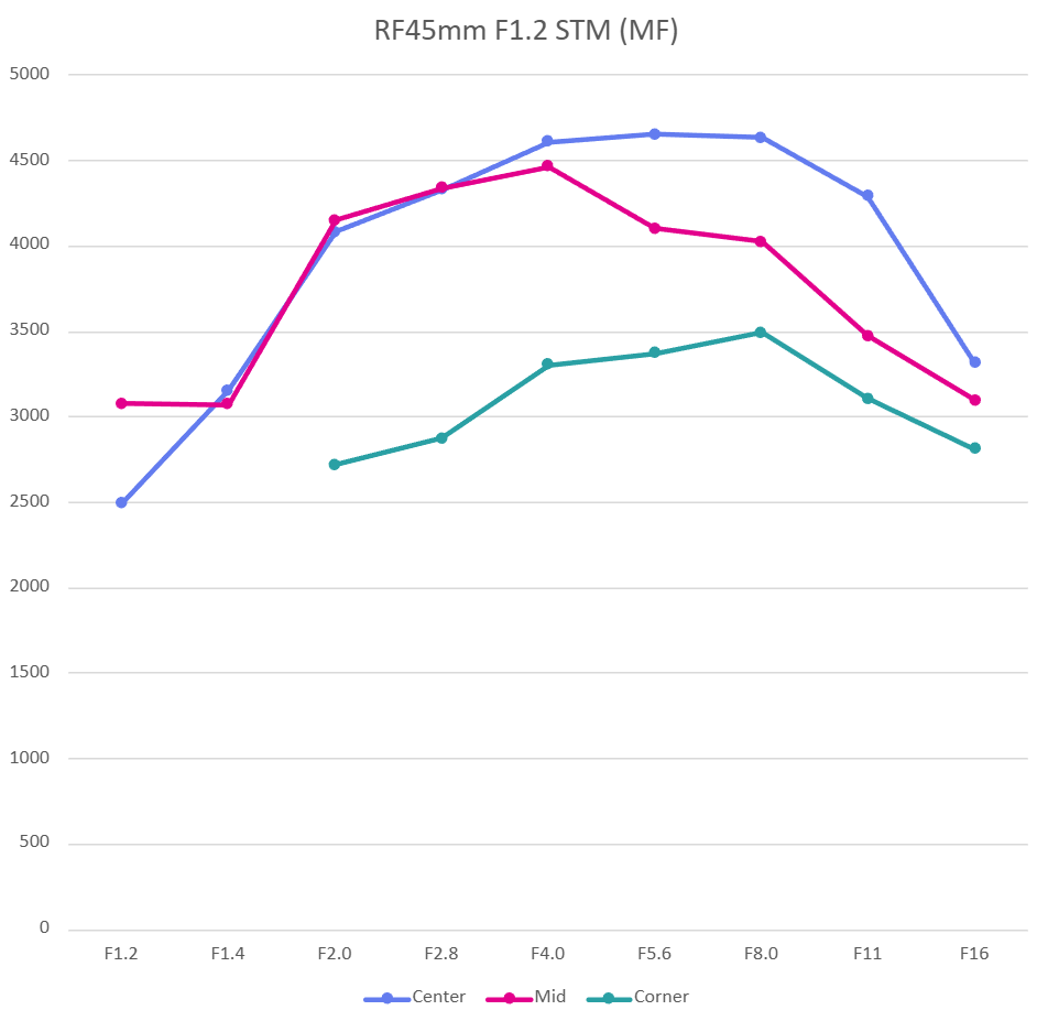 ご覧のように、中央の数値が一般的な弧を描くようになりました。F1.2の絞り開放で数値は低めですが、F4-5.6のピークにむけて急速に改善します。周辺も中央と同程度の結果が得られるものの、四隅は絞っても大幅な改善は期待できないようです。