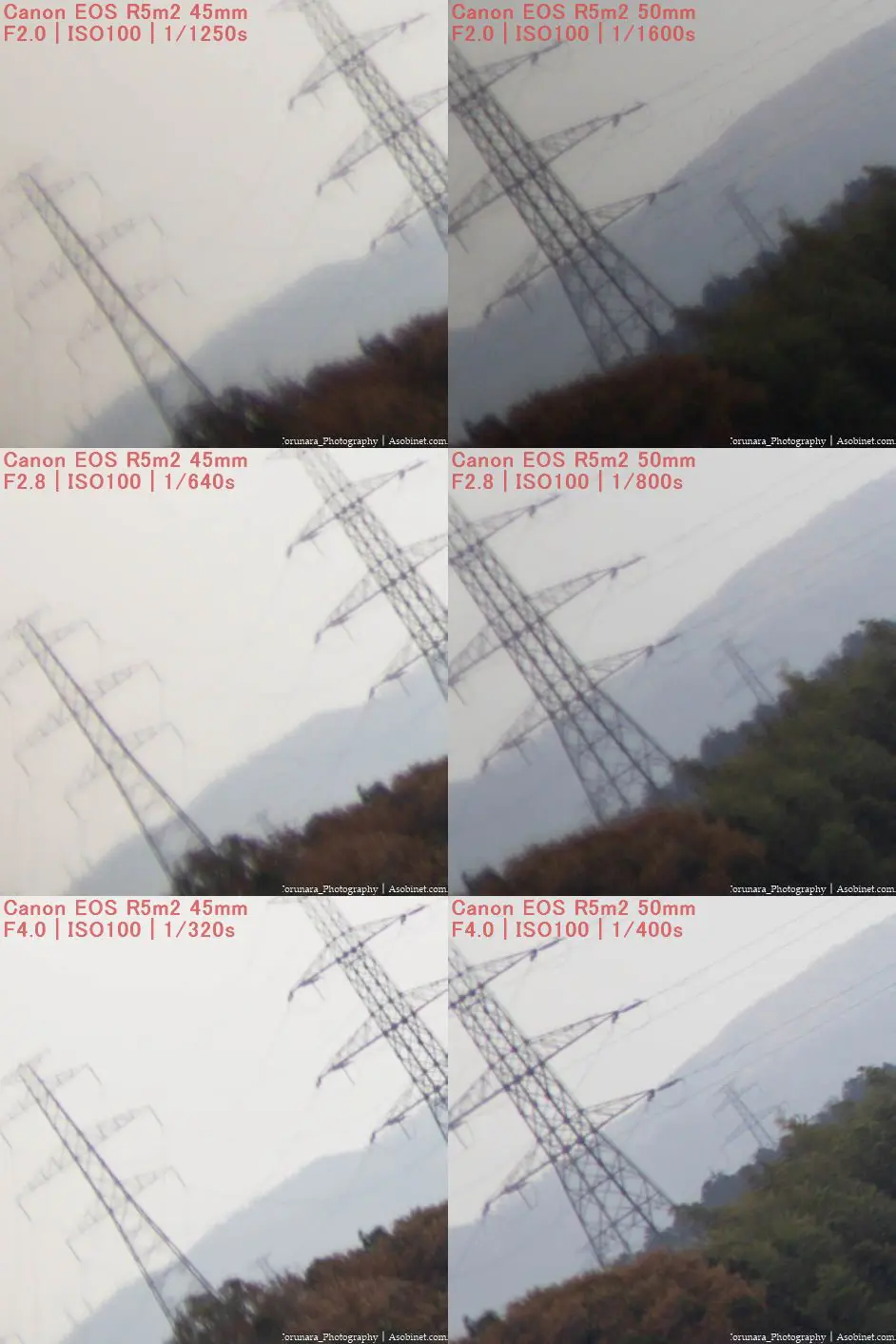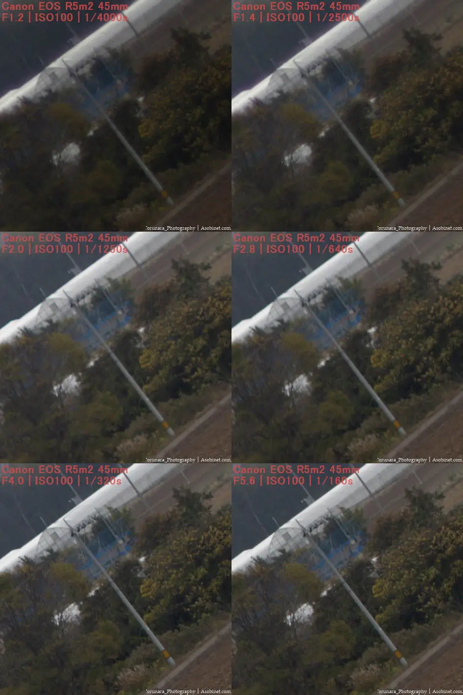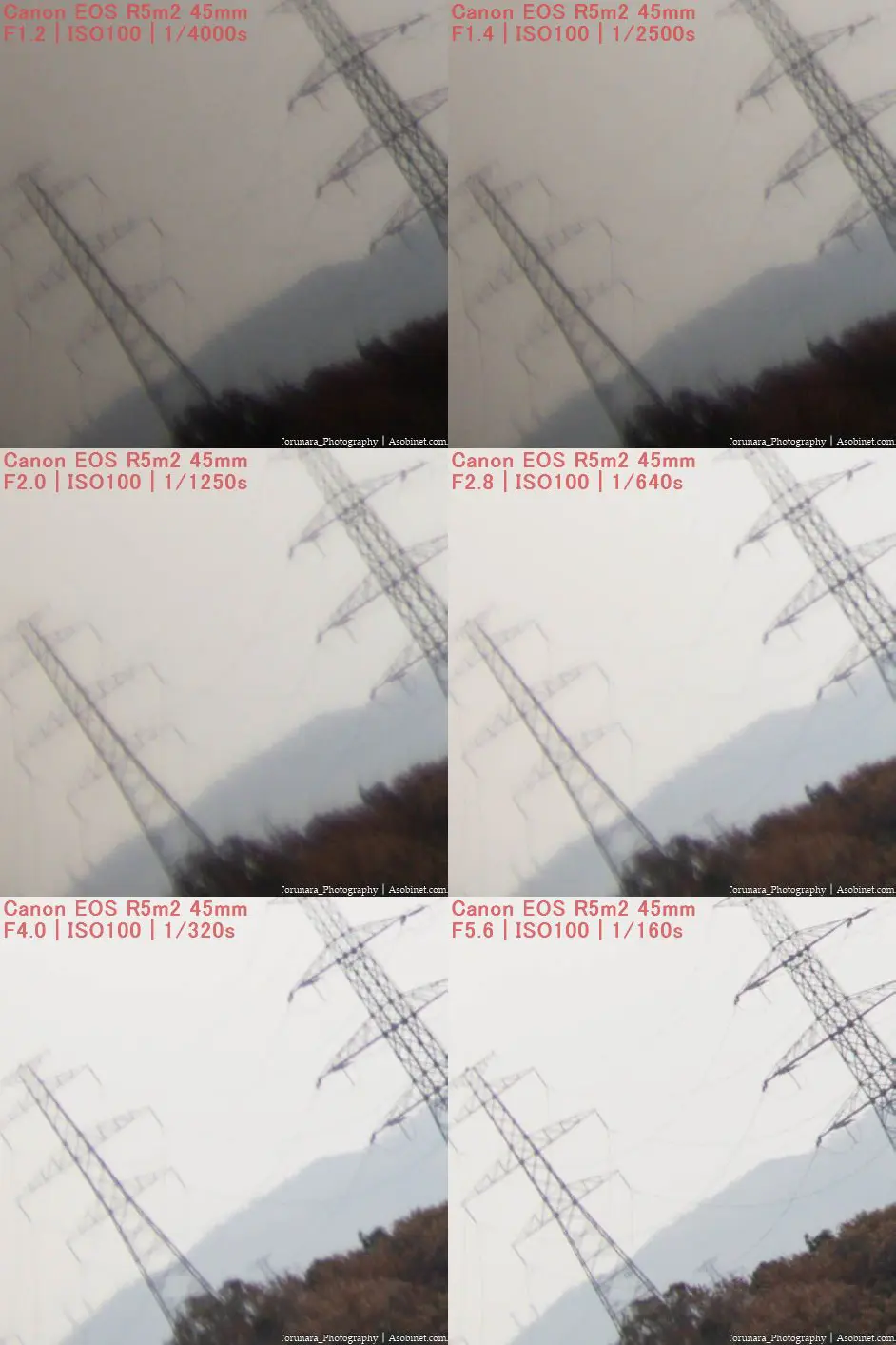 同じ絞りを使用した場合、有意な違いはありませんでした。敢えて言えば、RF45mmのF2がコントラスト高め。F2.8以降はほぼ同じ。
