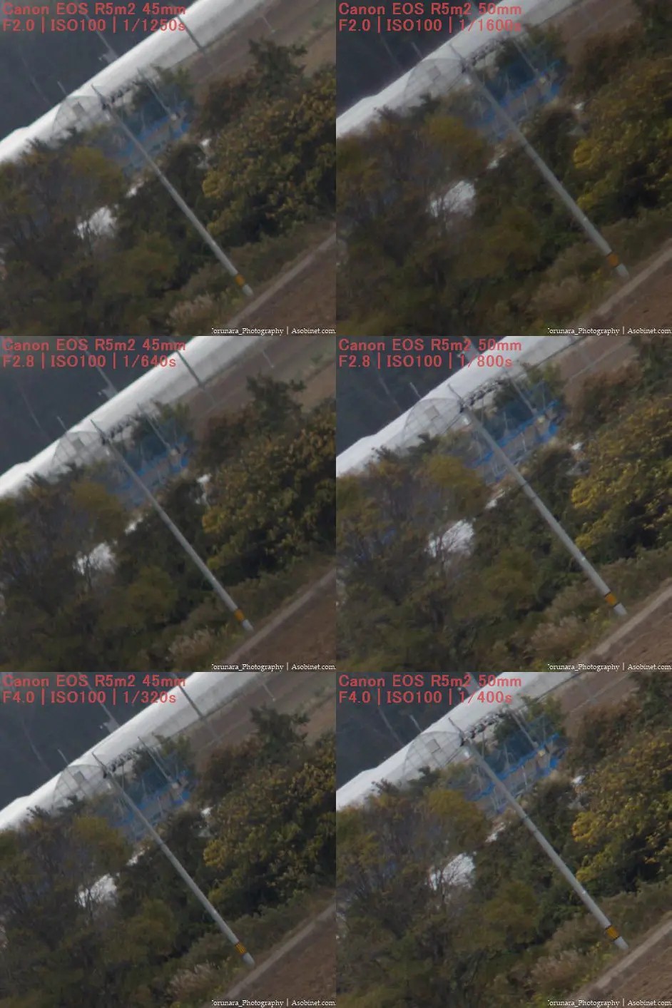 F2はRF45mmがやや良好、F2.8ではRF50mmがやや良好、F4まで絞るとほぼ同じ。