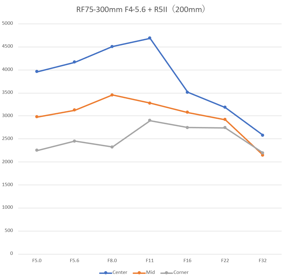 中央の解像性能が低下しますが、絞ると改善します。とはいえ伸びしろが少なく、F5.6で妥協するのも一つの手。日中屋外で絞れるのならF8-F11がおススメ。周辺や隅は絞り開放から安定していますが、数値は高くありません。また、倍率色収差の影響が顕著で測定結果に影響を及ぼしています。