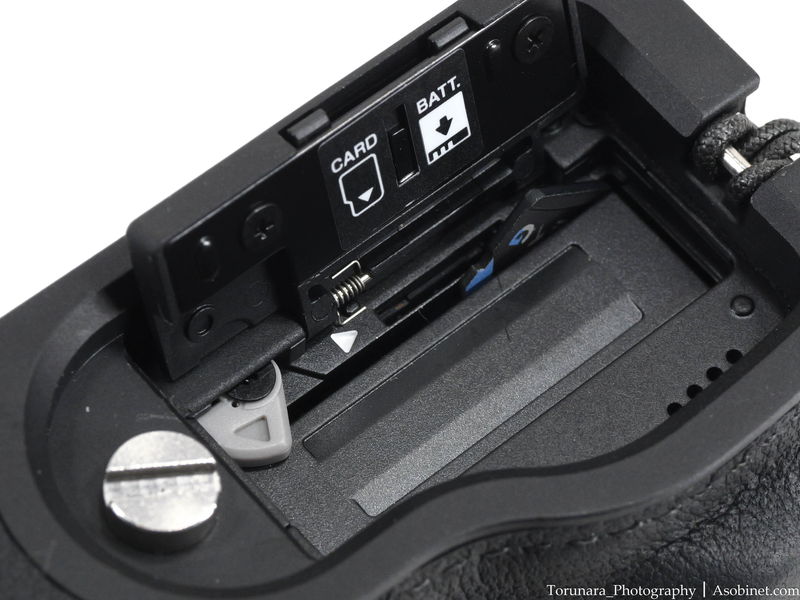 カメラ右側、グリップを上下から挟むような配置でストラップを取り付け可能。さらにカメラ左上部にも一か所あります。どのストラップ孔も開口部が小さく、取り付けるストラップの種類は要確認。