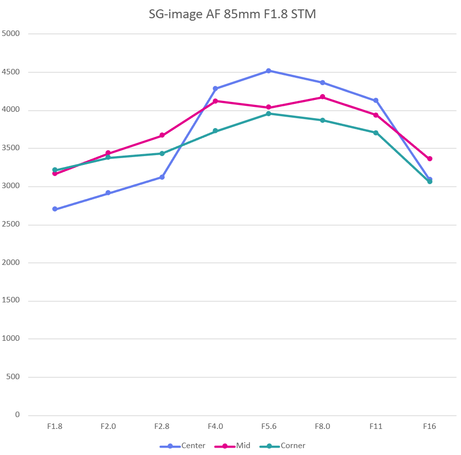 絞り開放は全体的に少しソフトですが、1段絞ると大幅に改善。さらにF5.6前後のピークに向かって全体的に良好な結果が得られます。同社のAF 55mm F1.8 STMとよく似た傾向。