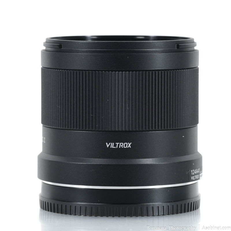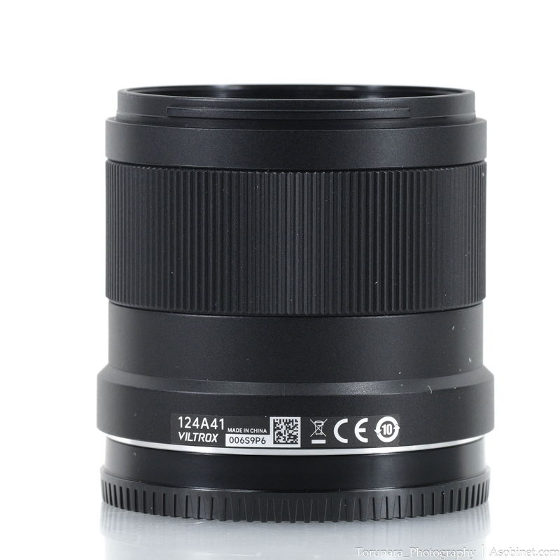 外装のデザインは非常にシンプル。唯一の装飾はレンズのロゴですが、プリントされたもので加工はありません。「VILTROX」のロゴが無ければ、メーカーを特徴づける意匠は無し。シリアルなどはシールで張り付けたもの。