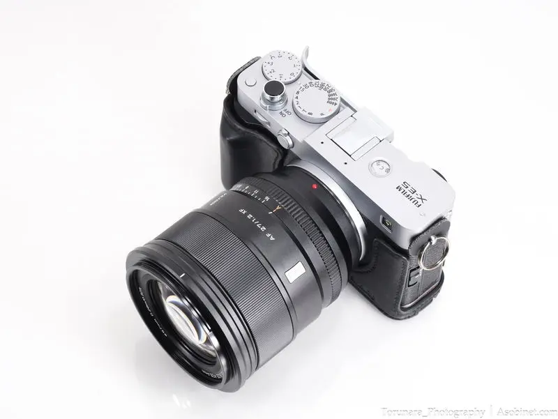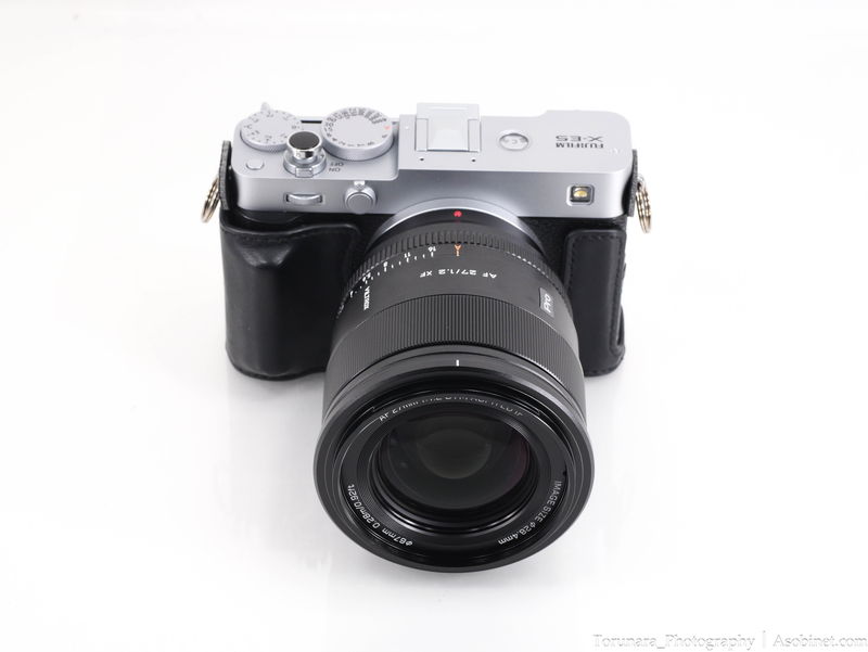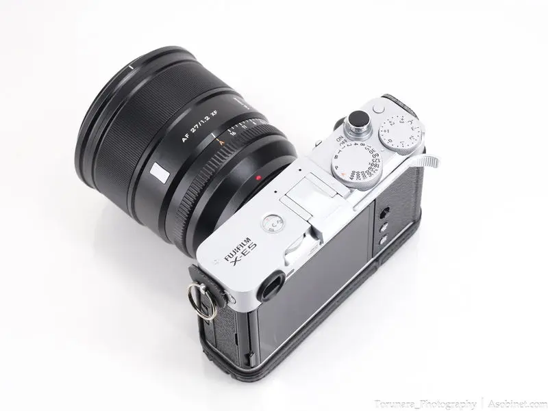 FUJIFILM X-E5に装着。27mmレンズとしてはかなり大きく重いものの、許容できない程ではありません。高性能なF1.2の大口径レンズと考えると、このくらいなのかなと。