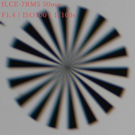 軸上色収差のテスト結果を確認すると、F1.4-F2.0-2.8の間でピントの山が遠側へ移動していることが分かります。絞り開放測距の場合、フォーカスシフトの影響に注意。