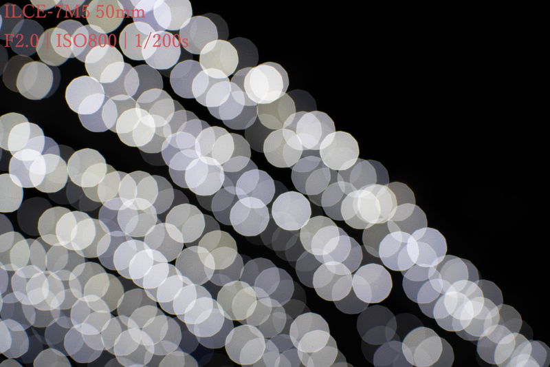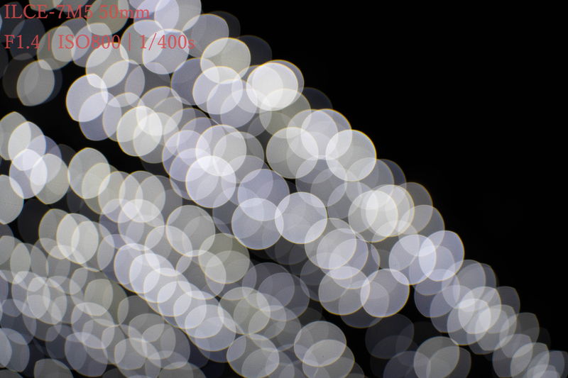 口径食が強いと、フレーム四隅のボケが楕円状に変形したり、部分的に欠けてしまいます。この問題を解消するには絞りを閉じるしか方法がありません。しかし、絞るとボケが小さくなったり、絞り羽根の形状が見えてしまう場合もあるので状況に応じて口径食を妥協する必要あり。