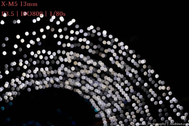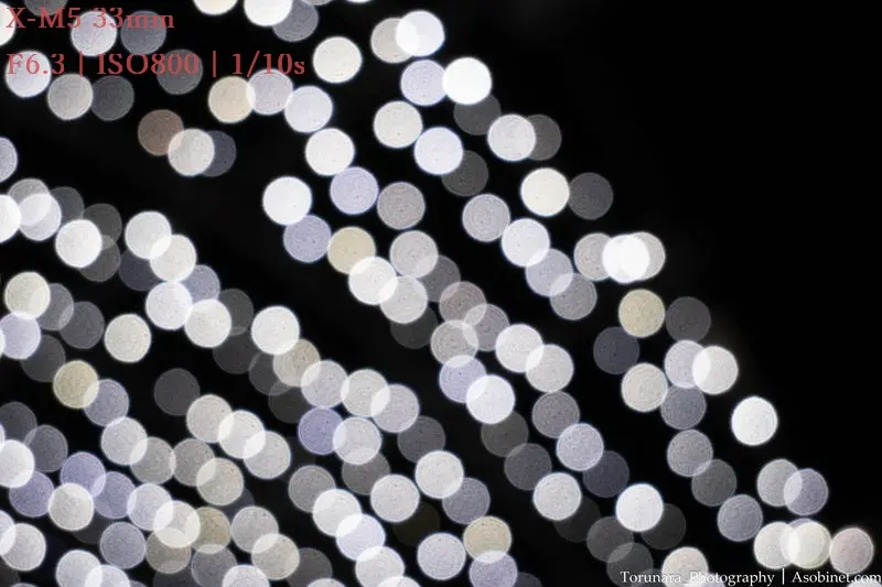 口径食が強いと、フレーム四隅のボケが楕円状に変形したり、部分的に欠けてしまいます。この問題を解消するには絞りを閉じるしか方法がありません。しかし、絞るとボケが小さくなったり、絞り羽根の形状が見えてしまう場合もあるので状況に応じて口径食を妥協する必要あり。