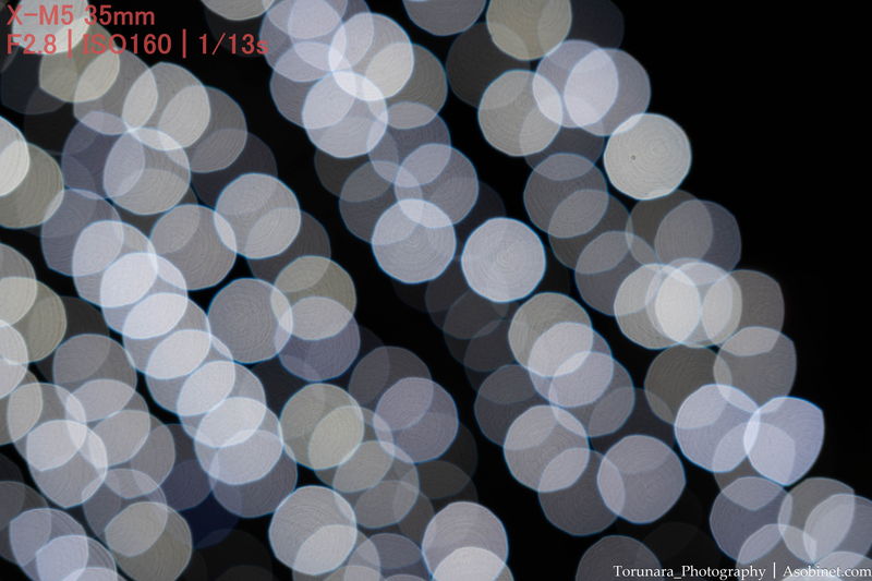 口径食が強いと、フレーム四隅のボケが楕円状に変形したり、部分的に欠けてしまいます。この問題を解消するには絞りを閉じるしか方法がありません。しかし、絞るとボケが小さくなったり、絞り羽根の形状が見えてしまう場合もあるので状況に応じて口径食を妥協する必要あり。