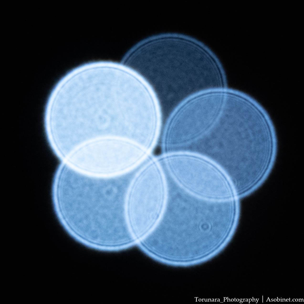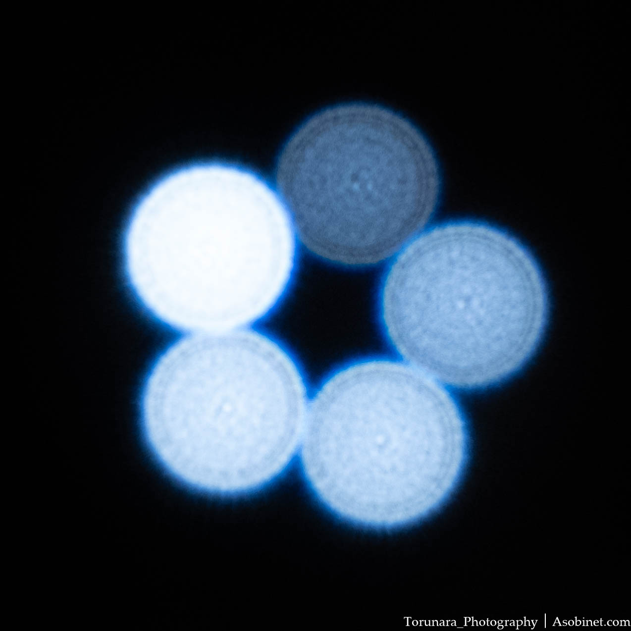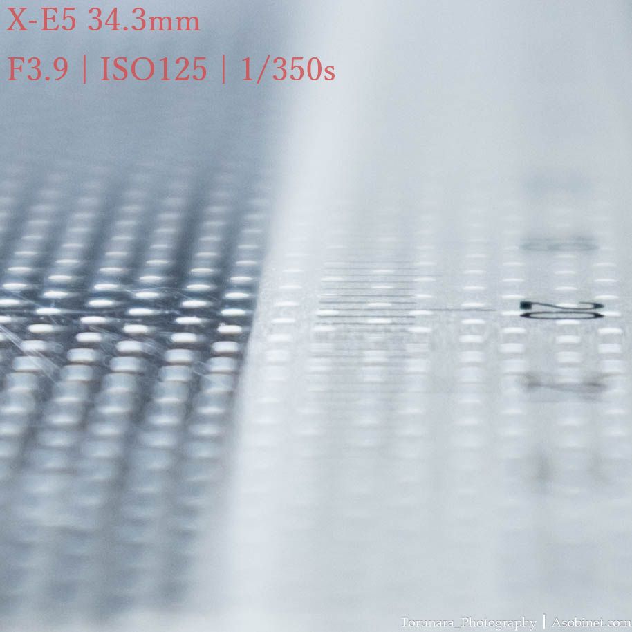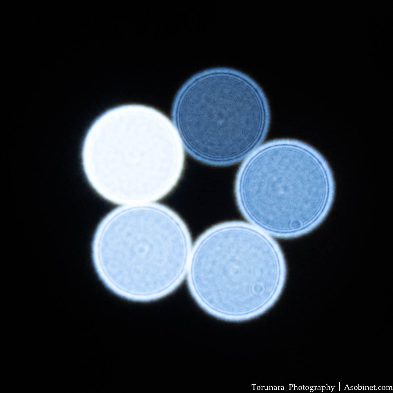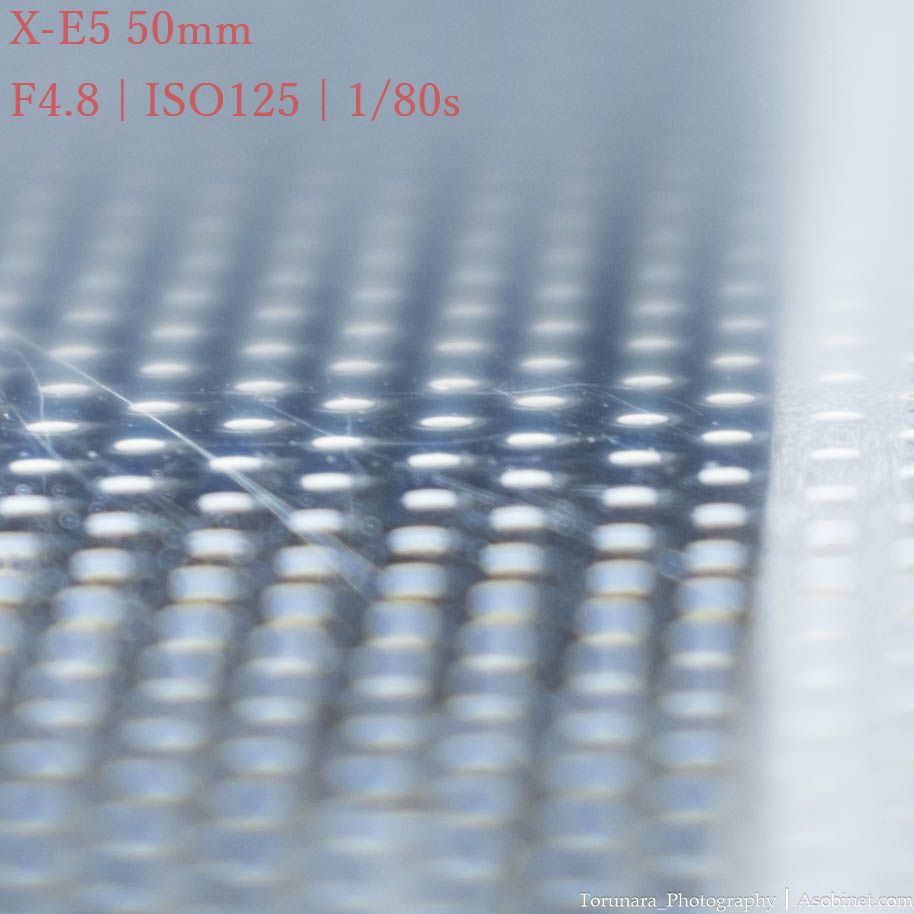 50mm F4.8を使用。前後のボケ質を比較してみると、描写に差があることが分かります。球面収差は完全に補正されておらず、チャートテストでのコントラスト低下など画質に影響が発生しています。