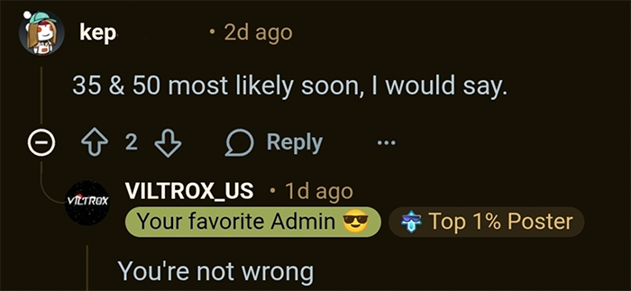 RedditのチャットでViltroxは、以前リークされていた新型35mmと55mmレンズが間もなく発売されることを認めた。