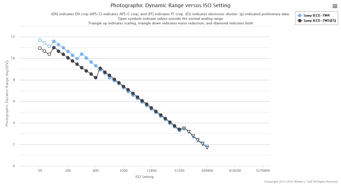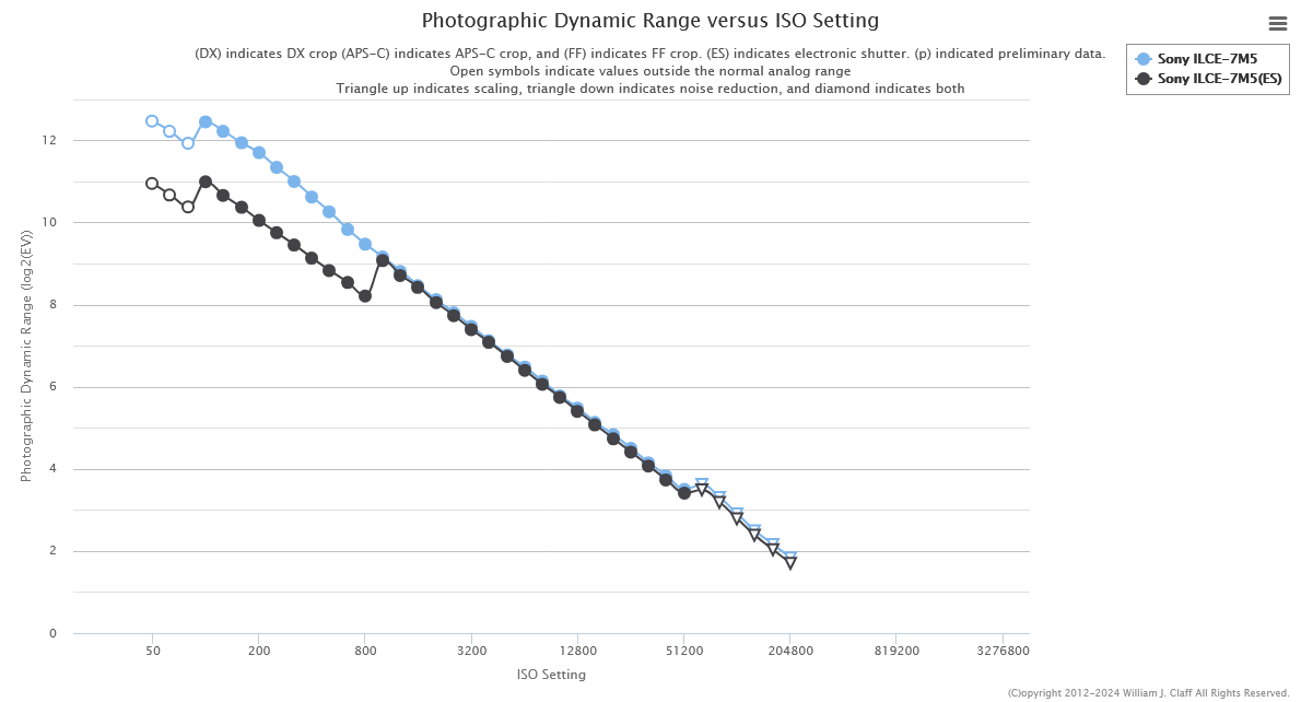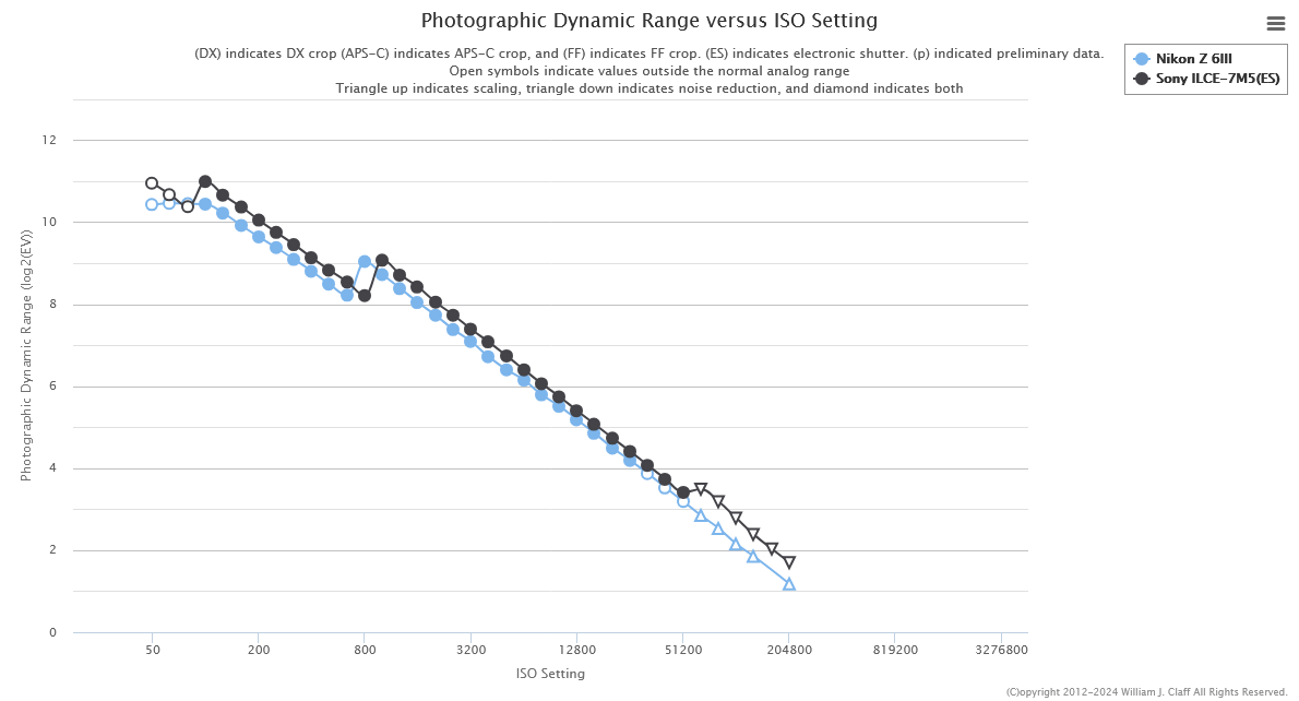 最大PDR 低照度ISO 低照度EV α7 V 12.47 6303 10.98 α7 ES 10.99 5973 10.90 α7 IV 11.71 5365 10.75 α7 III 11.60 6420 11.00 α9 III 10.00 4646 10.54 S1M2 11.75 5410 10.76 S1RII 11.08 8139 11.35 Z6III 10.46 4709 10.56 Z 6II 11.28 5298 10.73